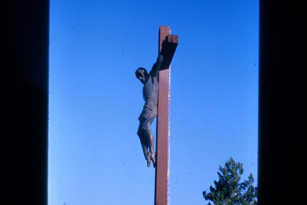 Photo of a large statue of Jesus on the cross. In the bottom right of the image is the top of a tree, as well.