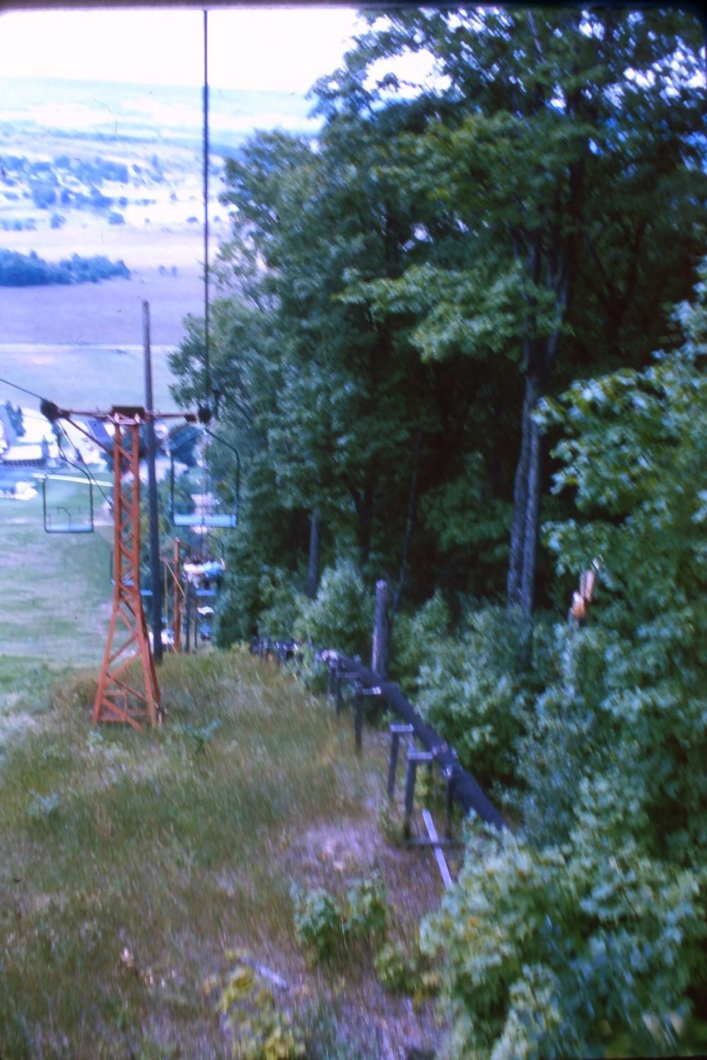 Aerial photo of a ski lift going down a mountain. Next to this ski lift is a small forest with large, thin trees. In the background is a flat plain with clusters of trees on it, as well.