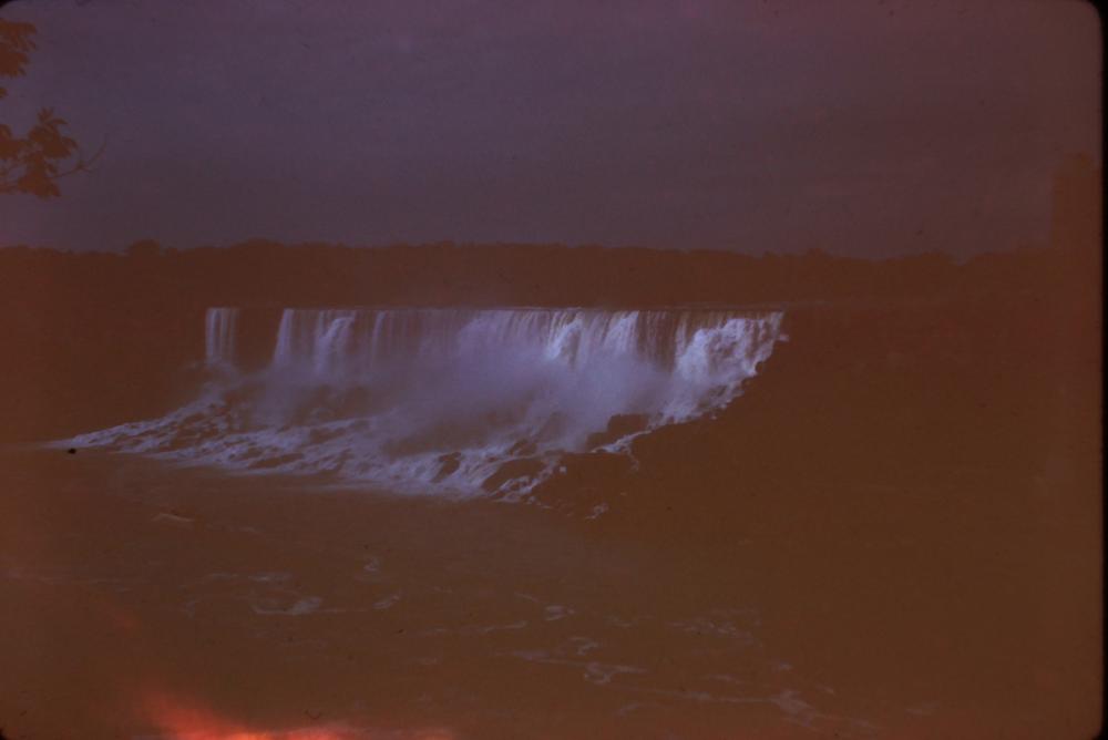 Photograph of people standing in front of waterfalls draining into a lake. To the right of the waterfall is a large cluster of trees.