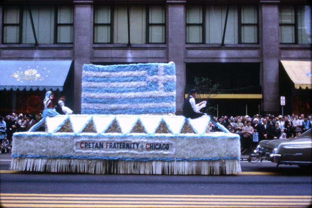 Photograph of a parade float going by, as crowds of people watch in the background, standing in front of buildings. The parade float's base is white with thin blue lines are the horizontal edges and white streamers facing below. Along the side of the float, there is a sign that reads "Cretan Fraternity of Chicago". The letters are all blue, except for the first letters of "Cretan", "Fraternity", and "Chicago". Above this base is a dark stand with white pendants coverings parts, creating a pattern of black triangles alternated by white triangles with blue borders. On top of this stand is a large Greek flag made using the same material as the rest of the parade float's exterior. Sitting around the flag, on top of the base, are several people wearing traditional Greek costumes.