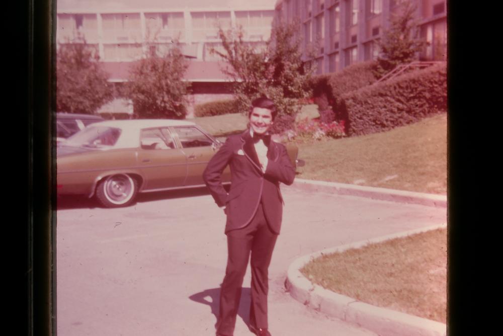 A photograph of a posing individual standing in a parking lot with two parked cars seen to the left and a building in the background. The individual is wearing a black tuxedo with a white dress shirt and black bowtie, with black dress shoes, and a white folded handkerchief touched away in the left-handside suit pocket.
