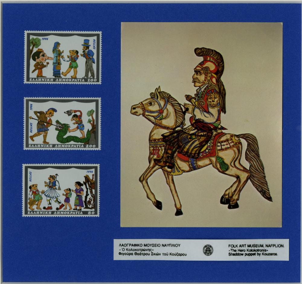 Framed postcard and stamps related to Karaghiozis, or Greek shadow puppetry.