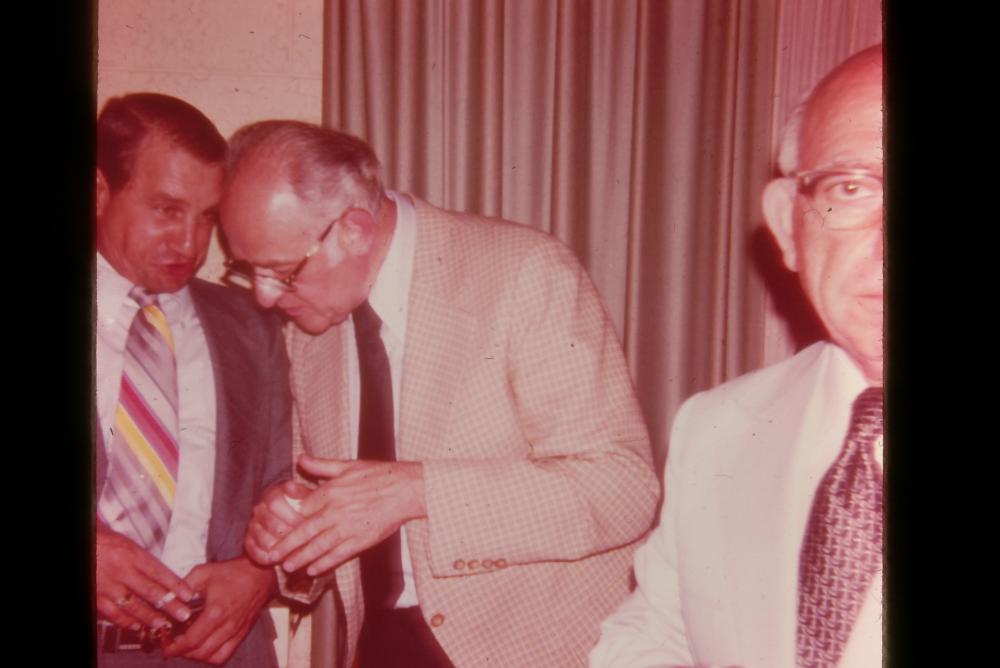 A photograph of three individuals in front of a window with a beige curtain. To the left of the photograph are two individuals who appear to be in a conversation. The person on the far left of the conversing individuals is wearing a gray suit, white dress shirt, and multi-color tie. The leaning induvial to the right of the gray suit, is seen wearing a beige color suit, white dress shirt, and black tie. To the right of the two chatting individuals is a cut-off figure of a person wearing a white suit, white dress shirt, patterned red tie, and a pair of glasses.