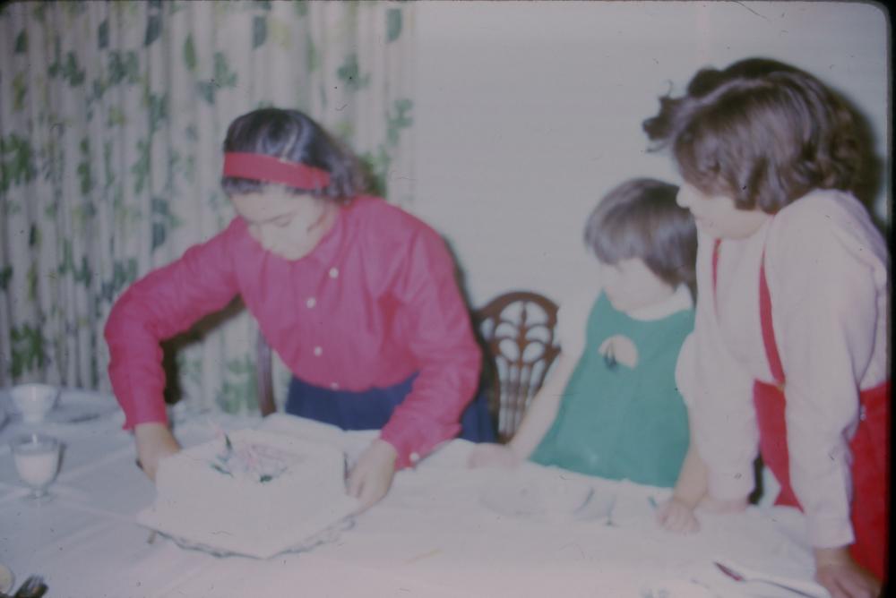 A photograph of three children standing at a dining room table. The room is decorated with a white and green flora curtain, a singular wooden chair, two white cups, and a white tablecloth. The curtains frame the figures within the photograph, emphasizing the birthday figure bright pink button-down shirt, blue jean skirt and pink headband. They are seen cutting a piece of the cake as the two children to the right-side watch. The two figures to the right of the photograph are perhaps the siblings of the birthday kid. The figure closest to the birthday child is dressed in a white undershirt and green dress with a rainbow patch. The figure to the far right is dressed in a white shirt and red overalls.