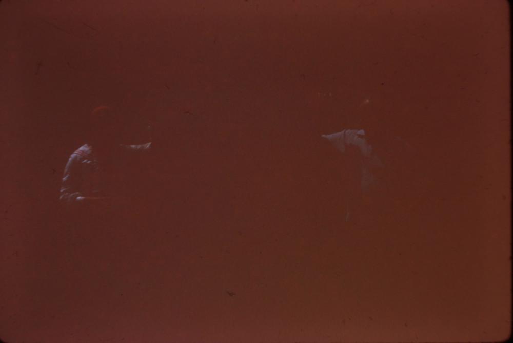 A dark photograph of what appears to be two people standing with their arms resting on a possible sign located between the two individuals. To the left of the image is a figure wearing a white shirt with red embroidery on the collar, and red hat. They have their right arm extended out and hidden behind a central object, a possible sign. To the right is a figure seen wearing a polo t-shirt. They appear to be leaning against what may be a sign with their left arm extended out and hidden behind the possible sign.
