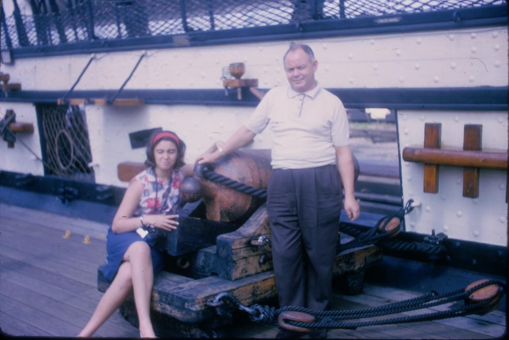 A photograph of two adults on a ship, posing with a canon placed between them. The person to the left is seen seat and wearing a white blouse with red and blue flora patterns, a blue skirt, along with a red headband and key card necklace. The individual to the right is wearing a white polo shirt and black plants. They are leaning on the canon with their left hand place on the loop.