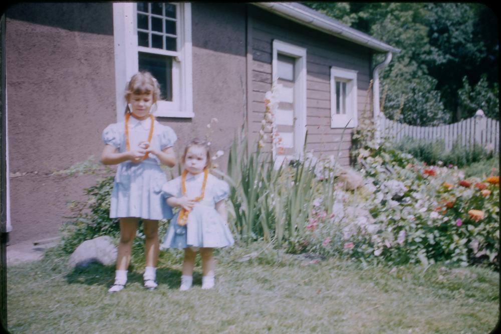 A exterior photograph of a house with two young children standing outside and a luscious garden. The house is a simple one-story brown structure with two white framed windows and a brown and white colored door. The children located to the left are dressed in a matching baby blue puff-bell sleeve dresses with a white collar, white waist bands, and white laced socks, a pair of black Mary Jane shoes, and orange beaded necklaces. To the right of the young children is a lively flower bed with blooming flowers, a white fence, and trees in the background.