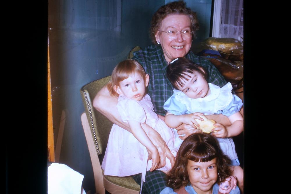 A photograph taken from the inside of a house that showcases a seated individual with two children placed on their lap and a child seated on the floor. The adult located on the central right hand-side is dressed in a green dress with blue stripes, earrings and rimless glasses. The child to the right is dressed in white puff-bell sleeve dress, and the child on the left is wearing a baby blue dress with a white lace collar. Below the seated individuals is the upper-portion of a smiling child. They are seated on the ground and are dressed in a possible a blue blouse with a brown vest and a small pink toy placed on the right-side shoulder.