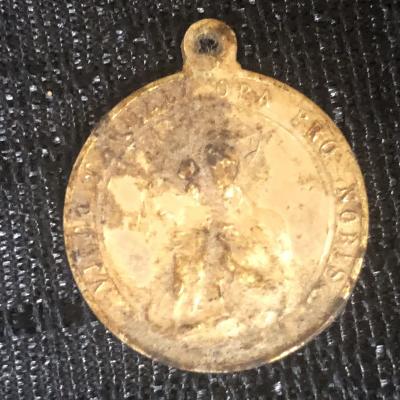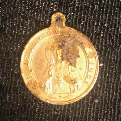 A round golden medallion with a metal loop attached at the top meant to service as a access point for a chain or string to be strong through. The font of the medallion has an image of Christ with semi-legible words circling Christ. The words read "Cor Jesu Redemptor Mundi." The back shows an image of two figures, presumably baby Christ being held by the Virgin Mary, surrounding the two are semi-legible words which reads "ORA PRO NOBIS."