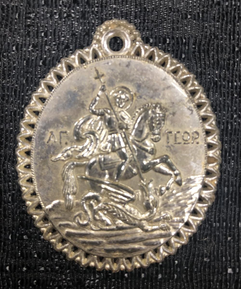 A oval medallion with a loop attached at the top through which one can run a string or a chain. The center portrays St. George in the thrones of battle with a dragon seen in the foreground. St. George adorned in battle armor and a cape, is shown riding a horse and holding a spear which is pointed at the mouth of the dragon.