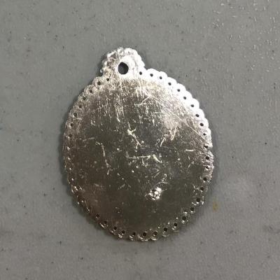 A oval medallion with a loop attached at the top through which one can run a string or a chain. The center portrays the Virgin Mary with baby Christ in her arms and flanked by angles baring objects. The Virgin Mary is adorned in layers of fabric that compose her garment and vail. Upon her head rest her royal crown and is set in front of her ornamental halo illuminating her divinity. Baby Christ is dressed in tunic with fabric draped along his shoulders.