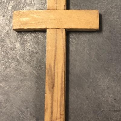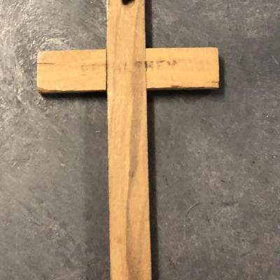 A wooden cross with illegible black printing going across the upper area with a small hole drilled into the top portion of the cross. The hole does not pierce through the back suggesting that a semi-precious stone may have been placed within.