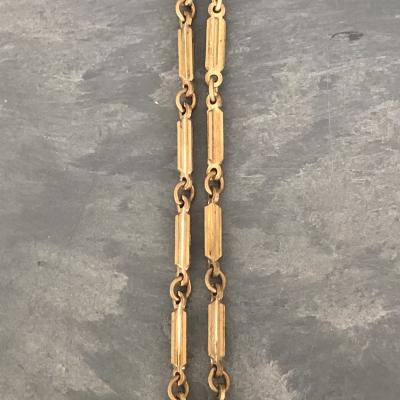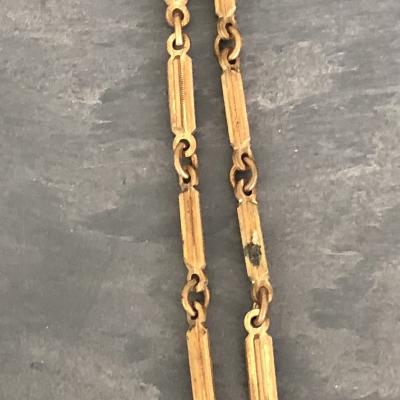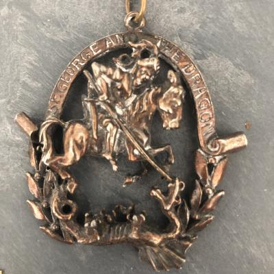 A long chained necklace with hook and claps meant to attach the object around the neck of the wearer, and a pendant with the image of St. George dressed as a knight with his spear pointed in the mouth of the dragon. The Pendant has an inscription that reads "ST GEORGE AND THE DRAGON."