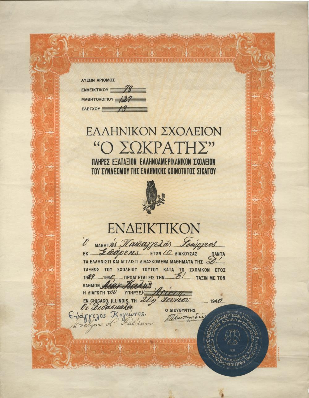 A certificate awarded by Greek school of Socrates. The diploma is printed on beige stationery with decorative orange border surrounding the text which is printed in black ink, and has the image of an owl resting on a tree branch, also printed with black ink located in the center. Towards the bottom is a blue award sticker with Greek text. The document is written in Greek, reading, "Greek School Socrates, Full six grade Greek American School of the Hellenic Community Association of Chicago. Indicative the student, Papagelis Georgios from Sparta, aged 10 who attend all the Greek and English classes taught in class D! during the school year 1939..1940 was promoted to the E! class with a grade of Very good. His conduct was Keopia in Chicago on June 14, 1932." The document is sign by the teacher and principle located at the bottom.
