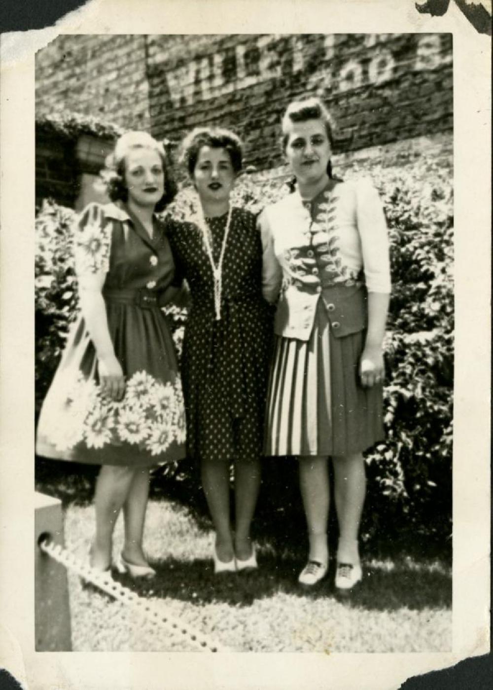 The photograph is owned by the Powers family and connected to other photographs and physical items from the same collection. Photograph of Three Powers sisters: Jennie (approximately 23), Georgia (approximately 20) and Bessie (approximately 17), dated 1943.