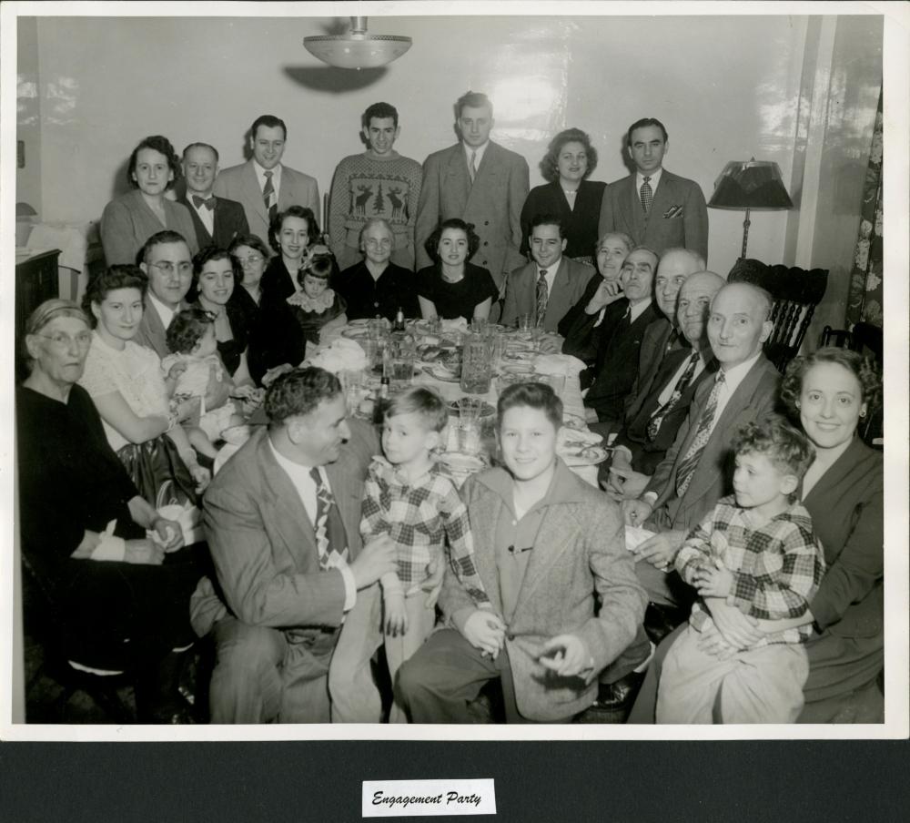 The photograph is owned by the Powers family and connected to other photographs and physical items from the same collection. Photograph is of Engagement party for Louis and Georgia (Powers) Kokinis, early 1950. Back row: James Loukas (third from the back row), George Powers, Bessie Powers, John Powers; left side of table: Dr. George Markoutsas (third from the left) with baby Elaine, Minnie Markoutsas, Mary Powers (mother of bride), Helen Loukas with daughter Maralyne, Georgia (Powers) Kokinis, Louis Kokinis, Metaxia Kokinis (mother of groom), George Kokinis (father of groom), Nicholas Powers (father of bride).