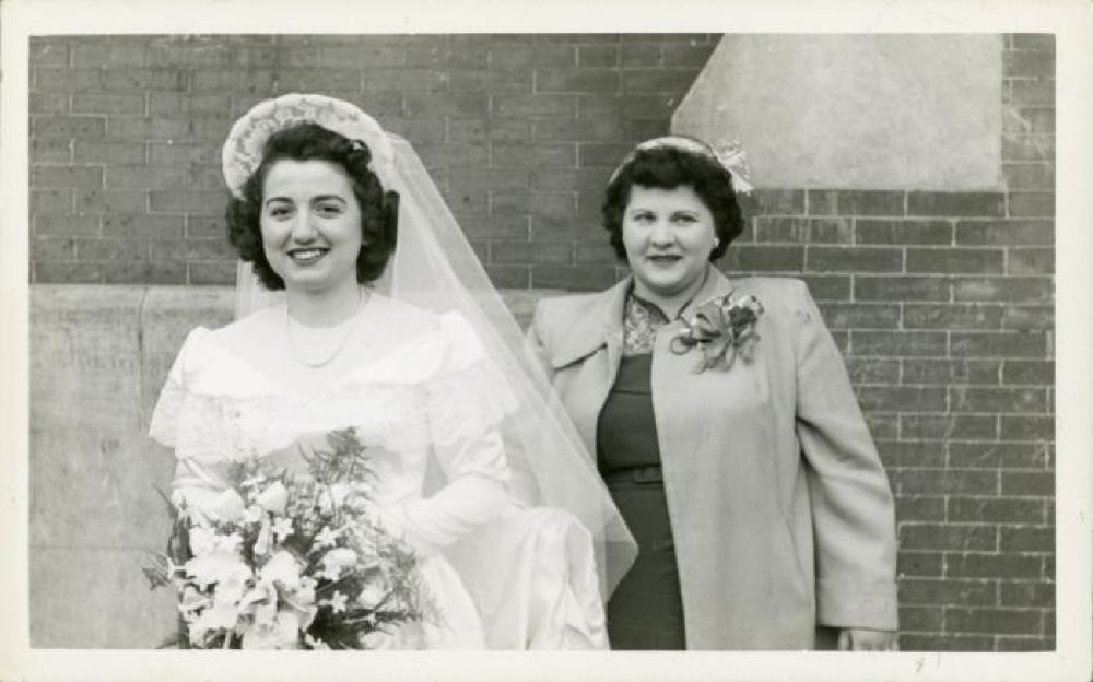 A black and white photograph of two individuals standing in front of a brick wall. The figure to the left, the presumed bride, is dressed in a wedding gown, a lacy head piece with a vail, and is a holding a bouquet. To the right is another individual, they are wearing an opened jacket with a boutonniere, a dress with a flora collar, and a hat.
