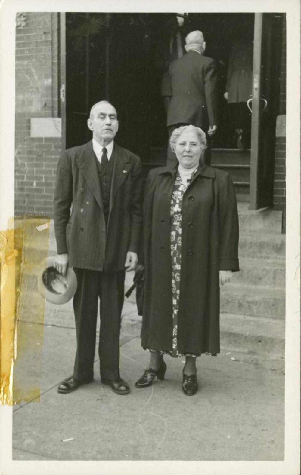 A black and white photograph of two posing individuals standing outside of a bricked building with two people walking through the doorway. The posing individuals, located in the central are formal dressed. The figure to the left is wearing a three-piece suite and is seen holding a hat with their left hand. The figure on the central-right is wearing a pattern dressed with heels, a pearl necklace, and open jacket.