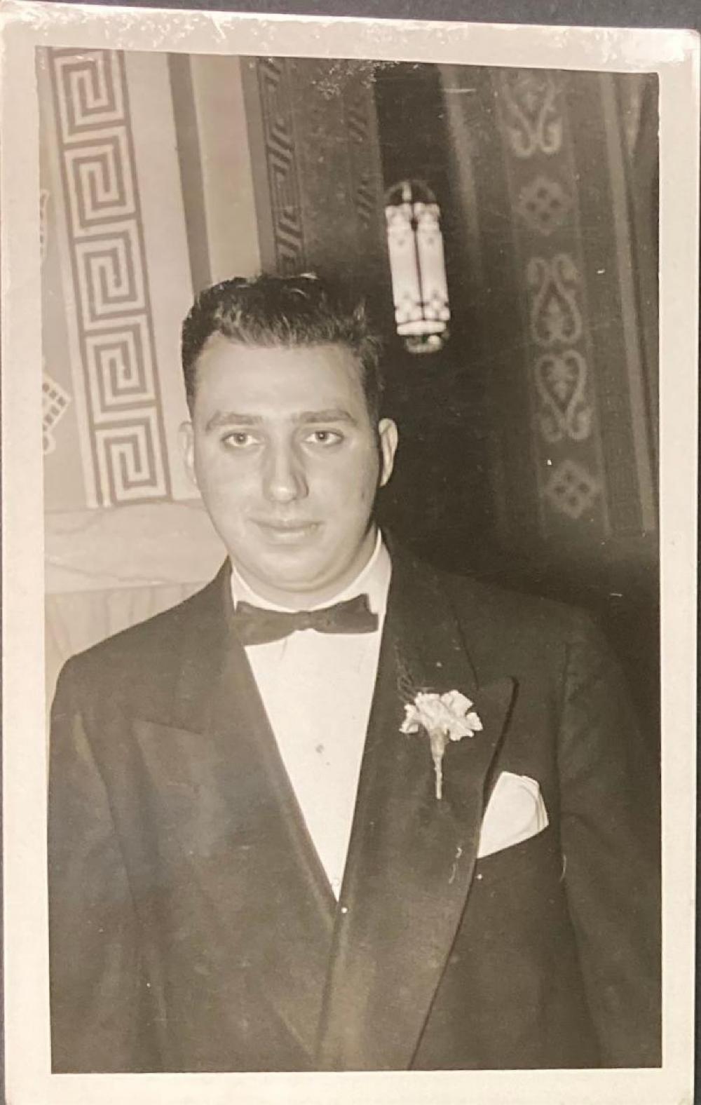 A black and white photograph of a individual posing inside of a possible church. The individual is dressed in a suit with a black bowtie, a boutonniere, and a handkerchief located to the right of the jacket. The background is composed of geometric pattern, such as the Greek key seen to the left of the individual's head and a hanging lamp seen in the center.