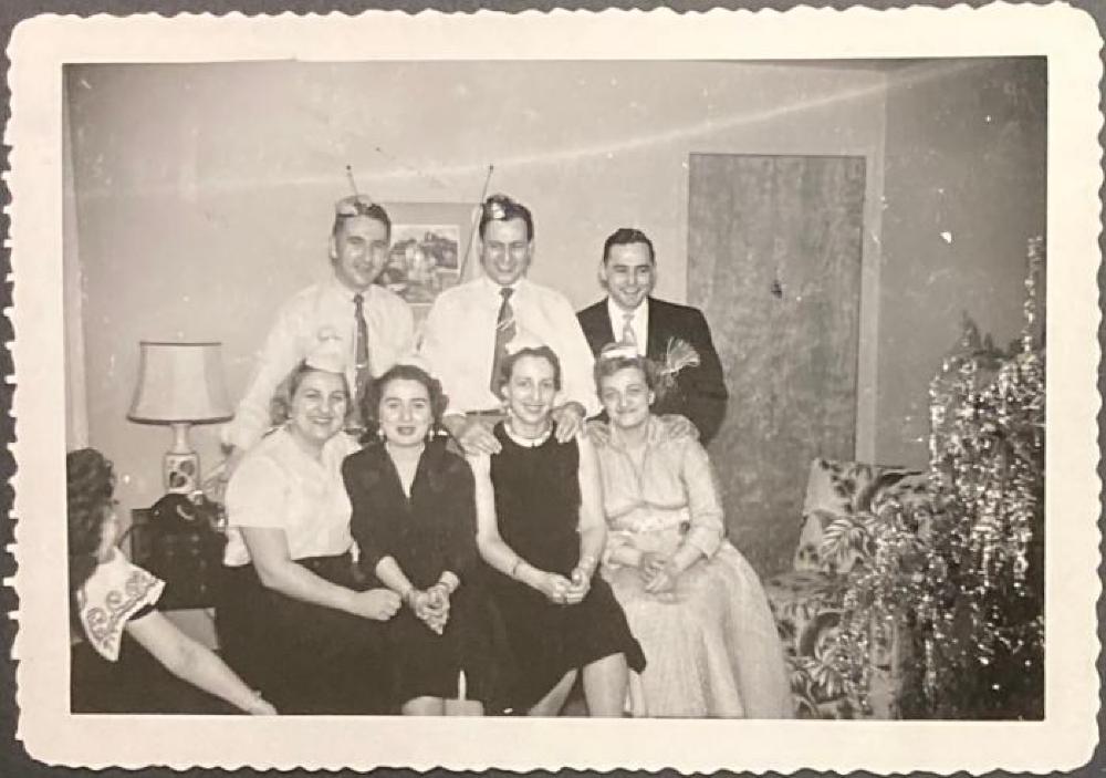 The photograph is owned by the Powers family and connected to other photographs and items from the collection. The photo is of a New Year's Eve party dated 1954: In the front row (l-r): Bessie Powers, Georgia (Powers) Kokinis, Helen (Kokinis) Loukas, Jennie (Powers) Boles; back row (l-r): Douglas Boles, James Loukas, and Louis Kokinis.
