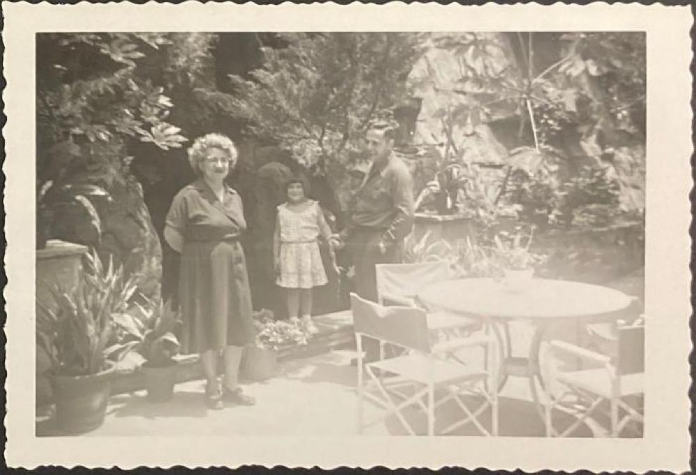 A black and white photograph of three individuals, two adults and one child, standing outdoors on a assumed terrace surrounded by greenery and rocky mountains. Located to the left is an individual wearing a dress, a pair of glasses and heeled shoes. In the center is a child, they are seen standing on a platform near a cave-like entrance and can be seen wearing a dress with socks and tennis shoes. To the central right-hand-side is an individual dressed in a long sleeved shirt and pair of slacks. They have their right hand inside their pant's pocket with their left hand holding the hand of the child. located to the far left is a round table with four chair and a flora central-piece.