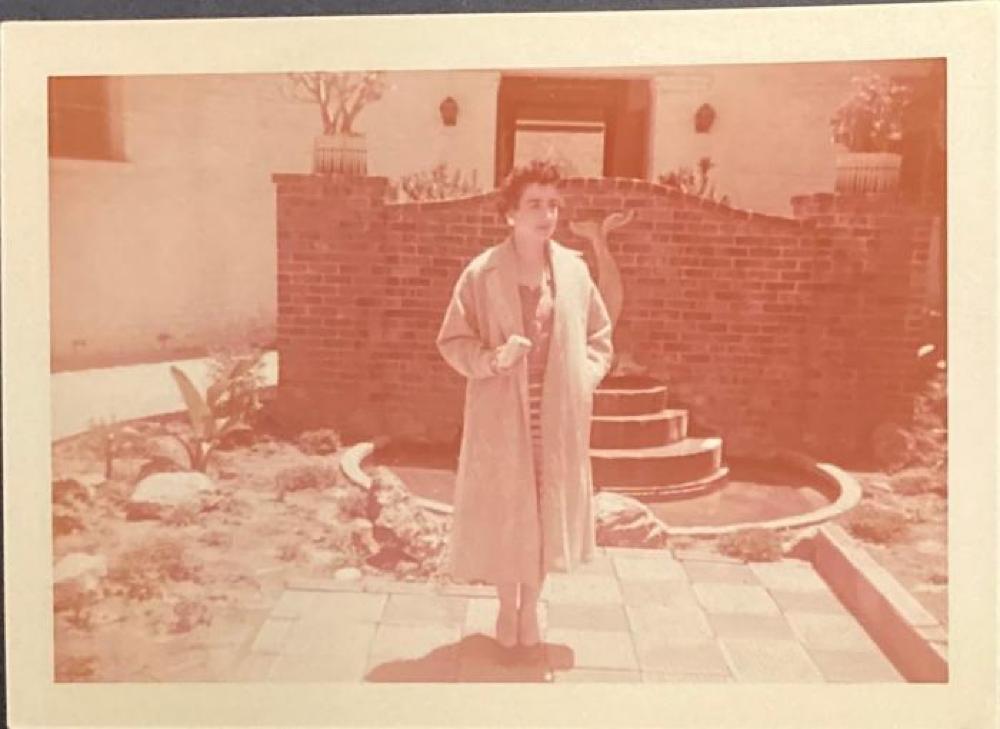 The photograph is owned by the Powers family and is connected to other items and photographs from the collection. The image is of Georgia (Powers) Kokinis vacationing in California in 1956.