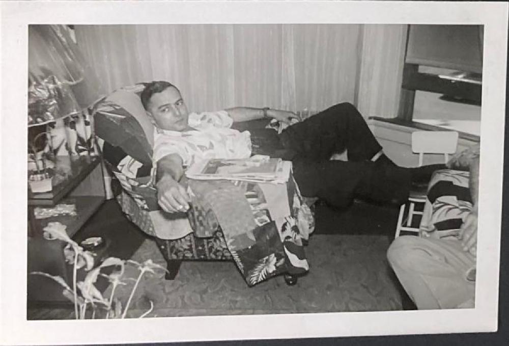 The photograph is owned by the Powers family and is connected to other items and photographs from the same collection. The photo, dated 1956, shows Louis Kokinis lounging around in his apartment.