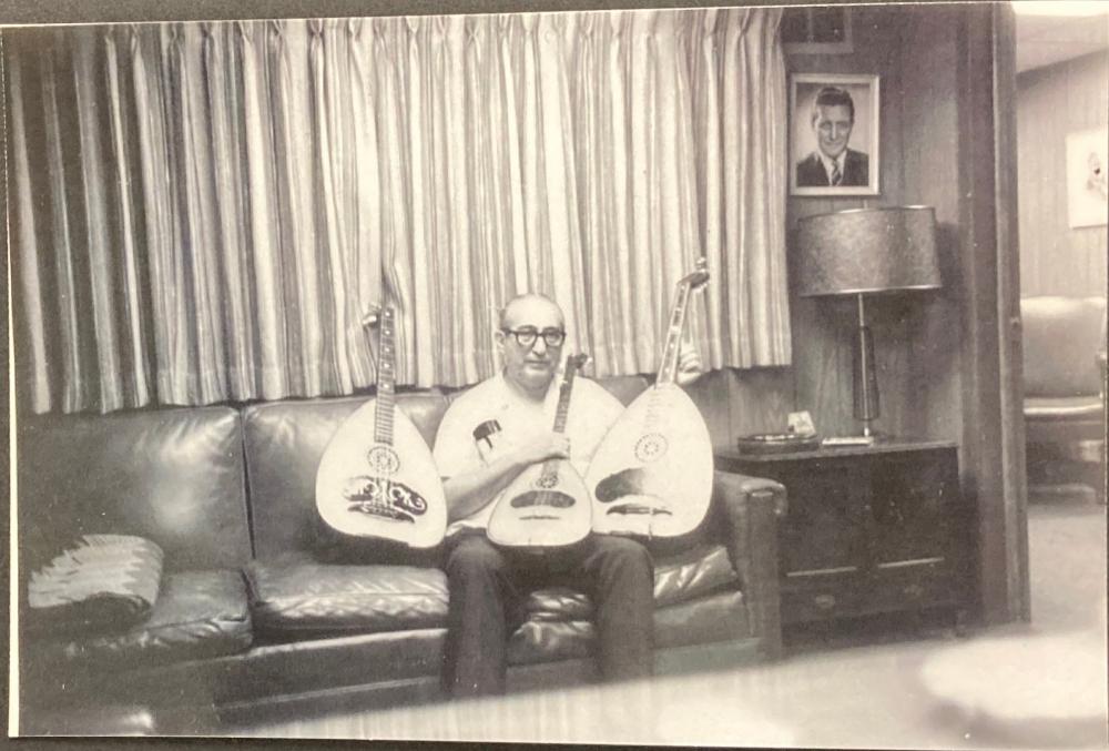 A black and white photograph of an individual seated on a sofa in a living room with three bouzoukias placed next to the individual (one on each side) and seated on the individual's lap. The living rooms consist of a leather sofa with a folded blanket, a large window with curtains, a hanging portrait placed above a end-table with a lamp and tray.