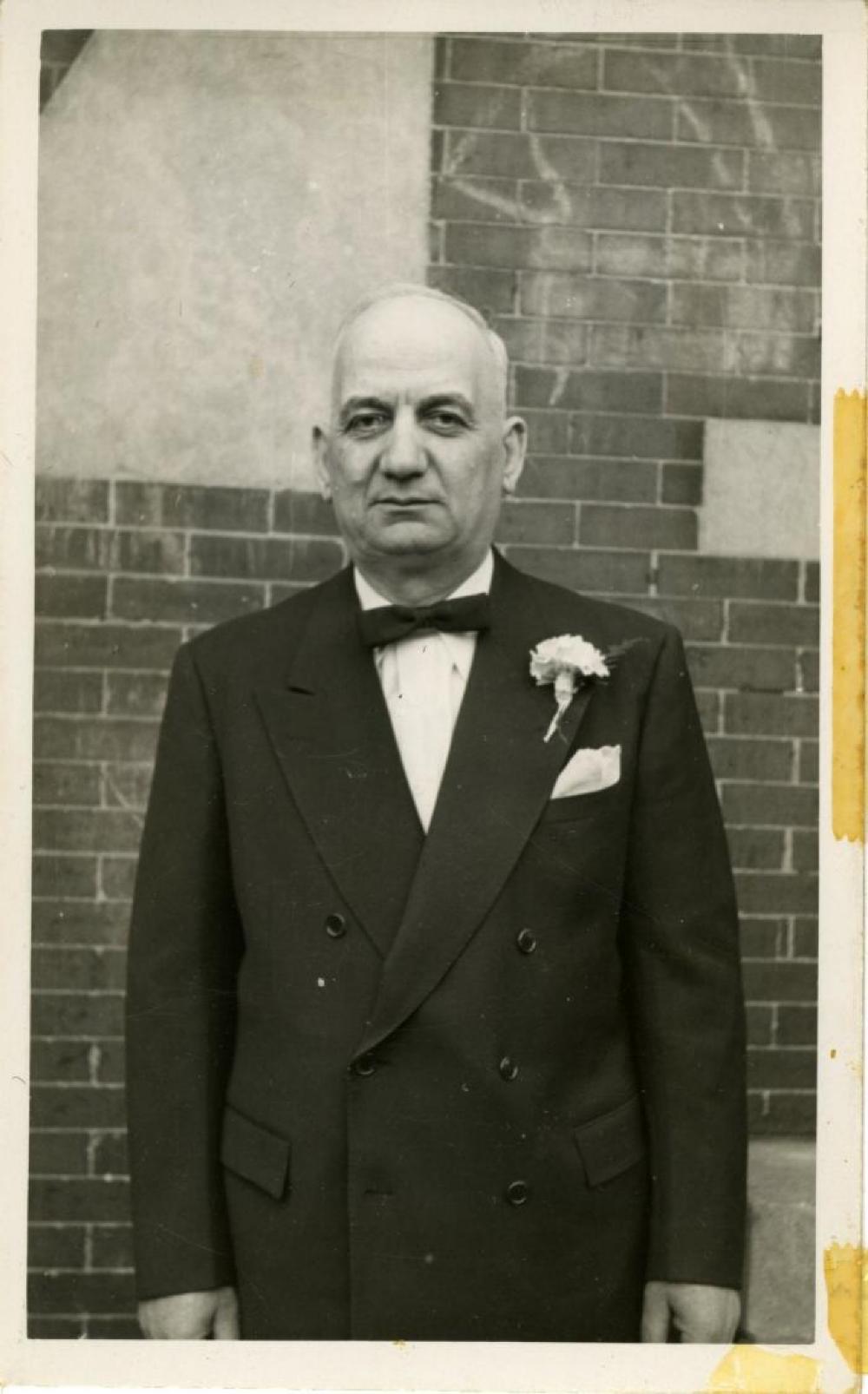 The photograph is owned by the Powers family and connected to other pictures from the same collection. The photograph is of Nicholas Powers at his daughter's wedding at Holy Trinity Church in Greek Town, dated 1950.