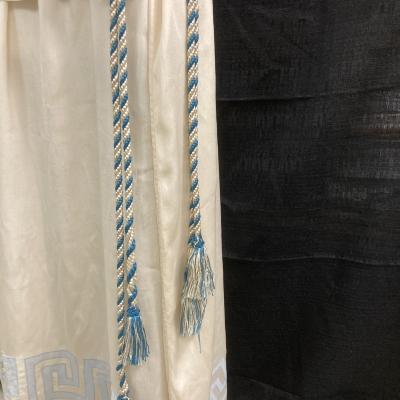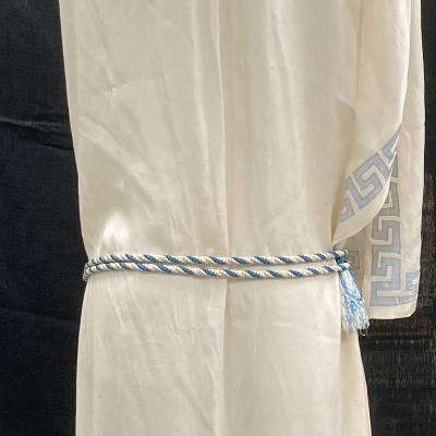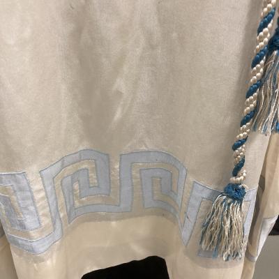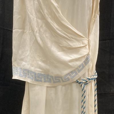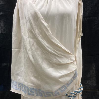 Off-white dress with blue Greek key patterns near the shoulders, base, and waist. There is a built-in sash that hangs off the shoulder.