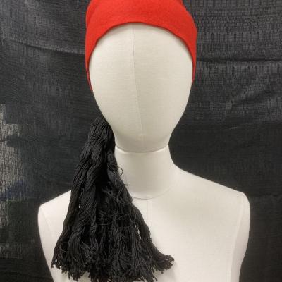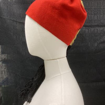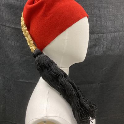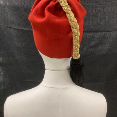 Rd fez hat with a gold braid that has a black tassel at the end.
