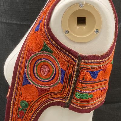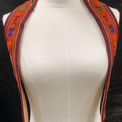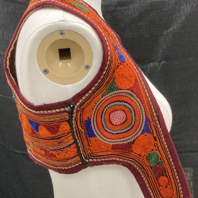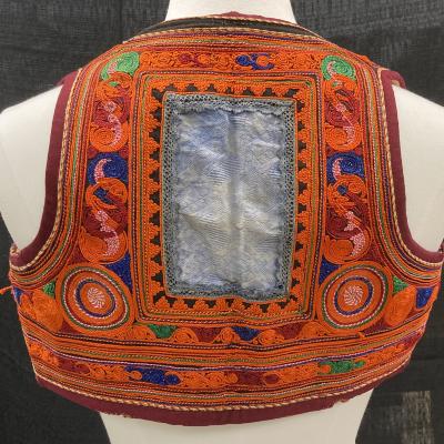 A small vest with multicolored embroidery throughout the item. There is a large, blue rectangle on the back with embroidery around the edge.
