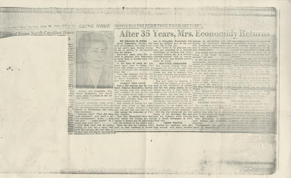 A faded black and white photocopy of a newspaper article with a small photograph of Mrs. Marie Economidy located on the upper left-hand side. The article is titled " GOING HOME PANTS FOR THE PLACE FROM WHICH SHE FLEW' After 35 Years, Mrs. Economidy Returns." The newspaper is taken from the Galveston News and is dated Sunday June 26, 1940. The article is written by Lillian E. Herz.