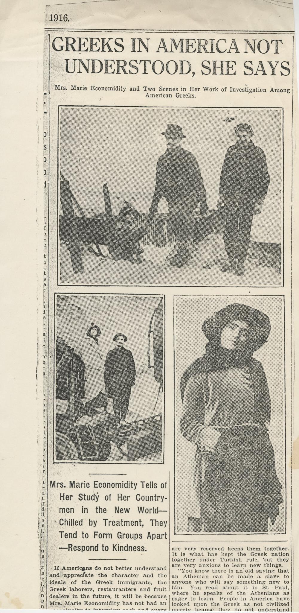 A black and white photocopy of a newspaper clipping displaying a close up versions of the three photographs from 1999.20.11.Located in the upper left corner of the page is the article date, 1916, with the article titled located underneath. The newspaper article is titled, “Greeks in America Not Understood, She Says.” Underneath the title is additional text typed in smaller font which reads, “Mrs. Marie Economidity and Two Scenes in Her Works of Investigation Among American Greeks." beneath the article title are three large photographs of individuals posing. The mage located on the bottom left corner is of Mrs. Marie Economidy, formally dressed in winter clothing. In the upper center is a photograph of thee individuals, Mrs. Marie Economidy (bottom left), with her hands interlocked with a central figure who appear to be holding luggage in his left hand. Located in the bottom left-hand-side, is photograph of two well dressed individuals posing between two automobiles.