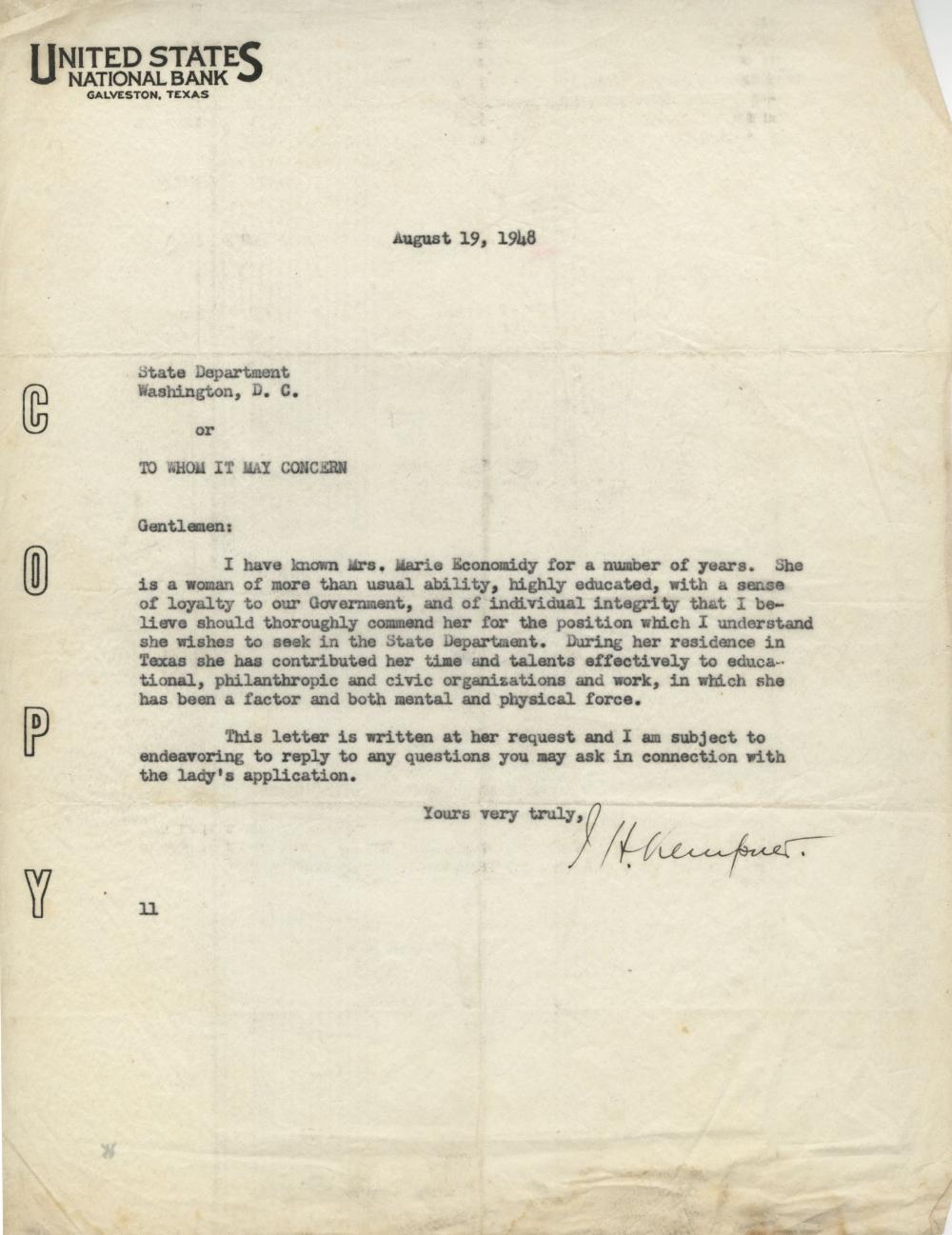 A typed letter of recommendation dated August 19, 1948. The letter is written in English and composed of paper and black ink. Located in the top left corner are the words, "United States National Bank, Galveston, Texas. Along the edges, left-side, is the words copy in caps lock. The letter reads, "States Department Washington D.C. or To who it may concern (typed all in caps locks). Gentlemen: I have known Mrs. Maria Economidy for a number of years, She is a woman of more than usual ability, highly educated, with a sense of loyalty to our Government, and of individual integrity that I believe should thoroughly commend her for the position which I understand she wishes to seek in the United States Department. During her resident in Texas she has contributed her time and talents effectively to educational, philanthropic and civic organization and work, in which she she been a factor and both mental and physical force. This letter is written at her requests and I am subject to endeavoring to reply to any questions you may ask in connections with the lady's application. Yours very truly," illegible signature. On the left-hand-side, next to the T, is the number 11.