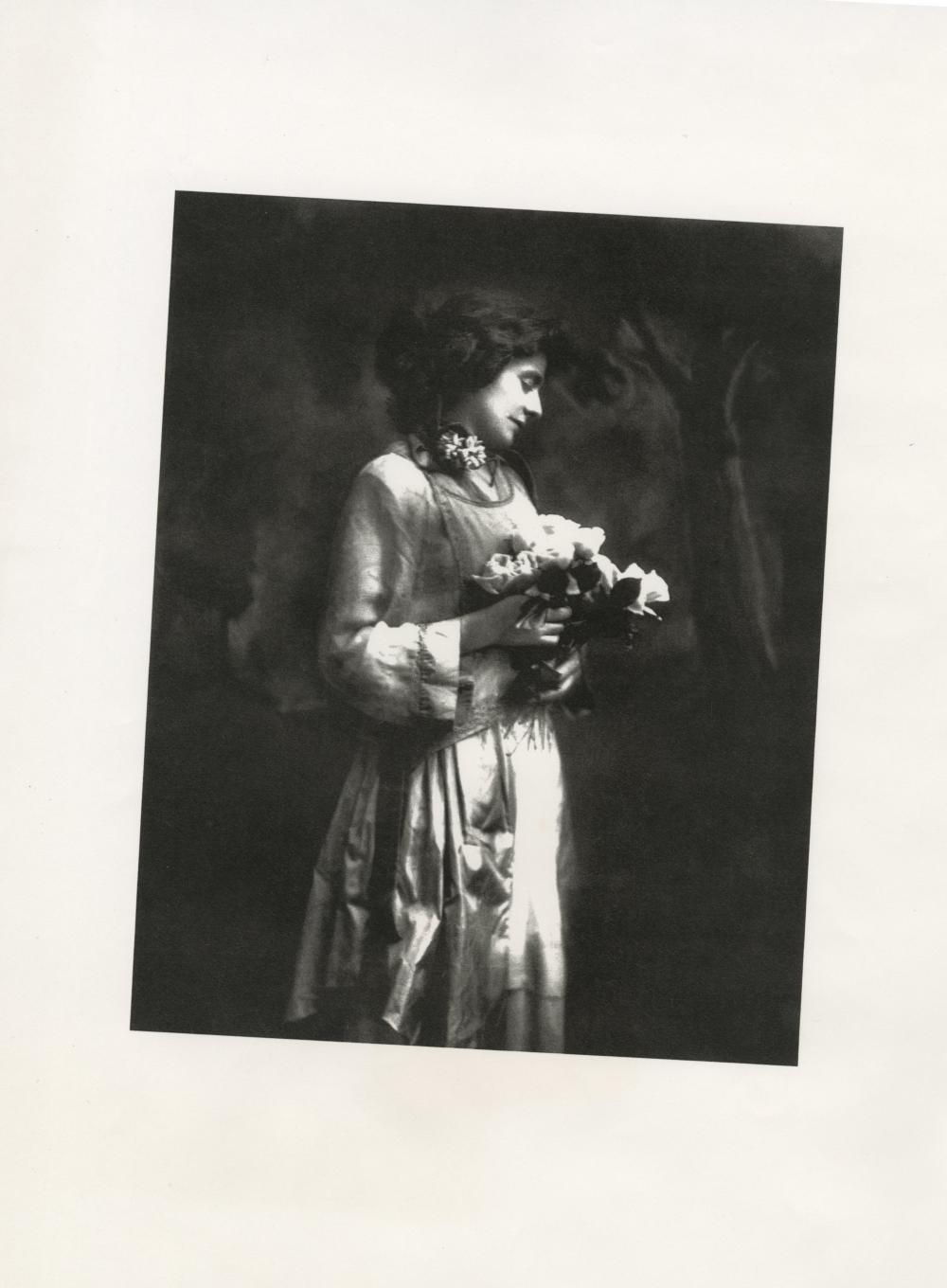 A black and white photograph of a young individual with her body faced away from the camera. The individual woman is standing, her face turned and casted downwards at the bouquet of flowers held closely to their chest. The figure has their hair done up in a complex bun and is wearing a long-sleeved dress with an apron and flowers adorning the nap of their neck. The background is composed of a screen with the image of a tree.