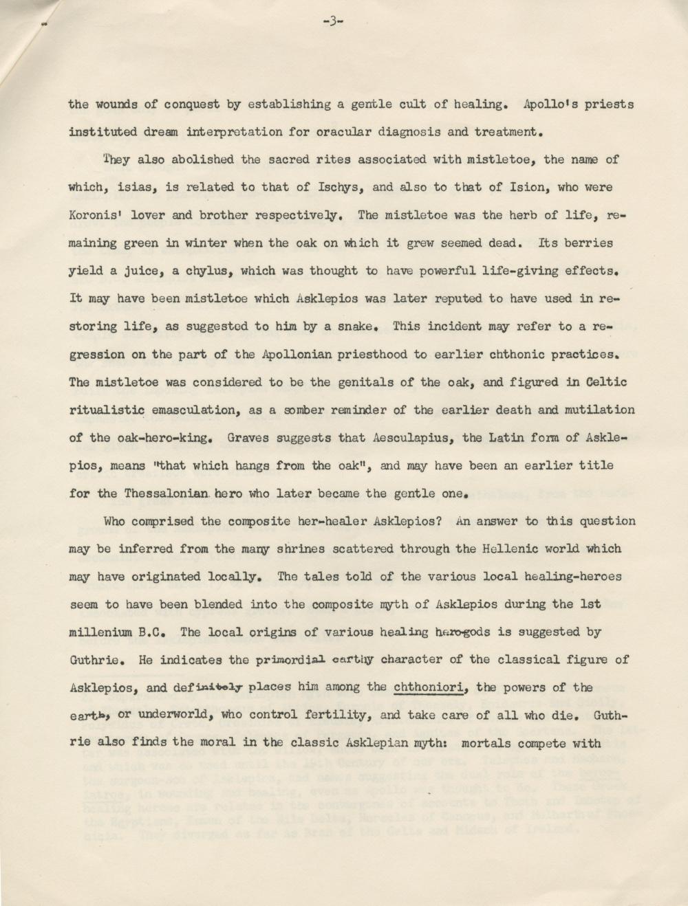 A typed ten paged document stapled together and is composed out of paper and black ink. The document, assumed lecture paper, is broken down into three paragraphs. Located at the top center of the page is the number -3-. The document reads, "The wounds of conquest by establishing a gentle cut of healing. Apollo's priests instituted dream interpretation for oracular diagnosis and treatment. They also abolished the sacred rites associated with mistletoe, the name of which, isias, is related to that of Ischys, and also to that of Ision, who were Koronis' lover and brother respectively. The mistletoe was the herb of life, remaining green in winter when the oak in which it grew seemed dead. Its berrie yirld a juice, a chylus, which was thought to have powerful life-giving effects. It may have been mistletoe which Asklepios was later reputed to have used in restorning life, as suggested to him by a snake. This incident may refer to a regression on the part of Apollonian priesthood to earlier chthonic practices. The mistletoe was considered to be the genitals of the oak, and figured in Celtic ritualistic emasculation, as a somber reminder of the earlier death and mutilation of the oak-hero-king. Graves suggest that Aesculapius, the Latin form of Asklepios, means :that which hangs from the oak", and may have been an earlier title for the Thessalonian hero who later became the gentle one. Who comprised the composite her-healer Asklepios? An answer to this question may be inferred from the many shrines scattered through the Hellenic world which may have originated locally. The tales told of the various local healing-heroes seem to have been blended into the composite myth of Asklepios during the 1st millennium B.C. The local origins of various healing hero-gods is suggested by Guthrie. He indicates the primordial earthly character of the classical figure of Asklepios, and definitely places him among the chthoniori , the powers of the oarth, or underworld, who controls fertility, and take care of all who dies. Guthrie also finds the moral in the classic Asklepian myths: mortals compete with […]."
