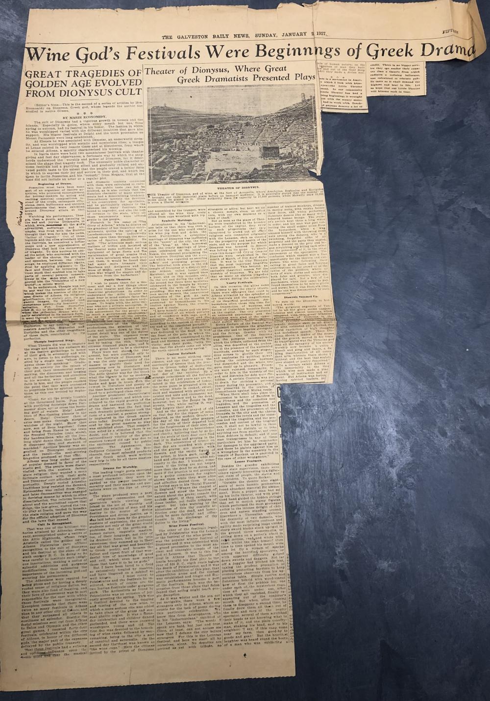 An aged newspaper page of an article typed in black ink. The newspaper is written by Mrs. Marie Economidy and is from The Galveston Daily News, dated Sunday, January 23, 1927, fifteen ed. The article is titled " Wine God's Festivals Were Beginnings of Greek Drama” “Great Tragedies of Golden Age Evolved from Dionysus cult.” Located on the right-hand-side is a black and white photograph of the theater of Dionysus. The article has tears and cut lines along the edges of the newspaper.