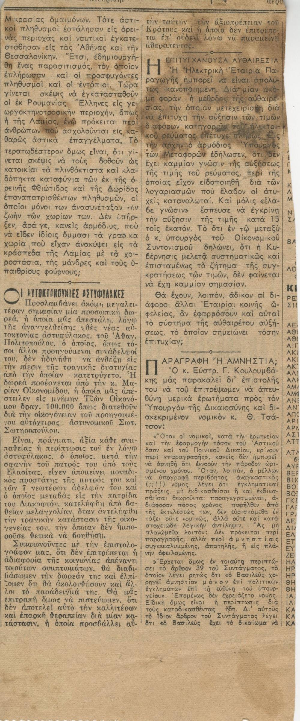 An aged newspaper clipping of an article typed in black ink. The clipping is small, written in all Greek, and is split into three sections titled: ΟI AYTOKTONOYNTEΣ AΣTYΦYAAKEΣ (English: Police Officers suicides), HEΠITYΓXANOYΣA AYΘAIPEΣIA (English: Successful Authority of Electric Company), and ΠAPAΓPAΦH H AMNHΣTIA (English: Registration or Amnesty?). Located on the top of the article is brown stains that cover the top portion of the article. Most of the stain damage can be seen in the upper-right-corner with similar, yet smaller stains located in the upper center and left-corner.