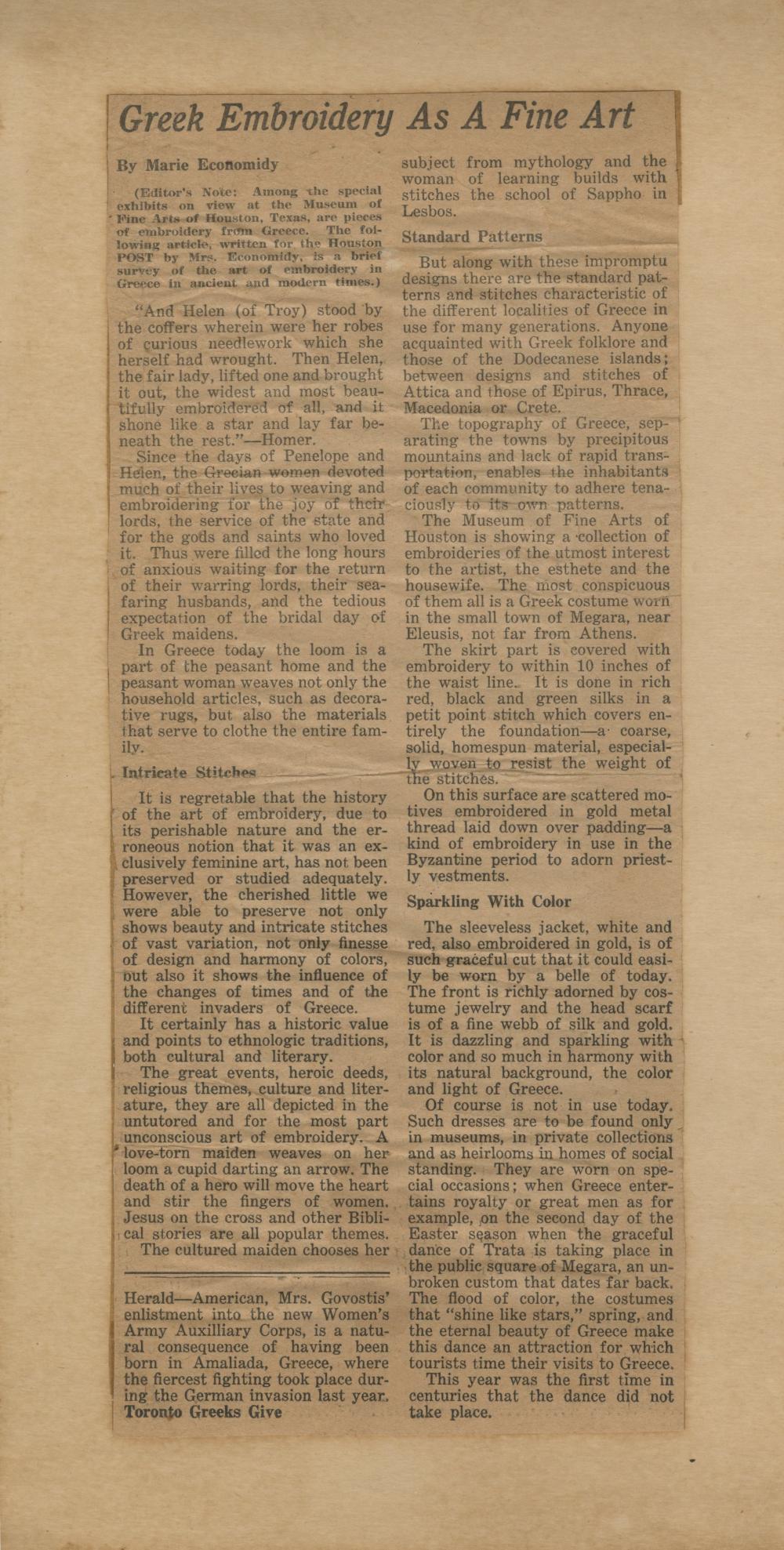 An aged newspaper clipping of an article typed in black ink. The newspaper article is written by Marie Economidy and is titled, “Greek Embroidery As A Fine Art.” The article is sectioned into three topics: “Intricate Stitching, Standard Patterns, and Sparkling with Color.” The article discusses the embroidery that is on display at the Museum of Fine Arts of Huston, Texas and is written for the Huston post as mentioned in the Editor note section located underneath the article title. The clipping is cricked and is glued onto what appears to be a rectangular manila folder.