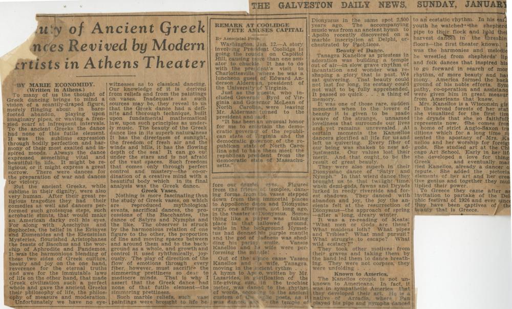 A page taken form the Galveston Daily News, dated Sunday January 13,1929. The newspaper page is titled: "Duty of Ancient Greek nces Revived by Modern Artists in Athens Theater." Part of the title is damaged due to the tear in the upper left corner. The article is written by Marie Economidy who was located in Athens during the article's composition. The article is broken down into three sections, Greek Vases, Beauty of Dance, and Known to America. Located in the top center of the page is a separate article unrelated to the article's topic, titled, Remark to Coolidge Pete Amuses Capital.