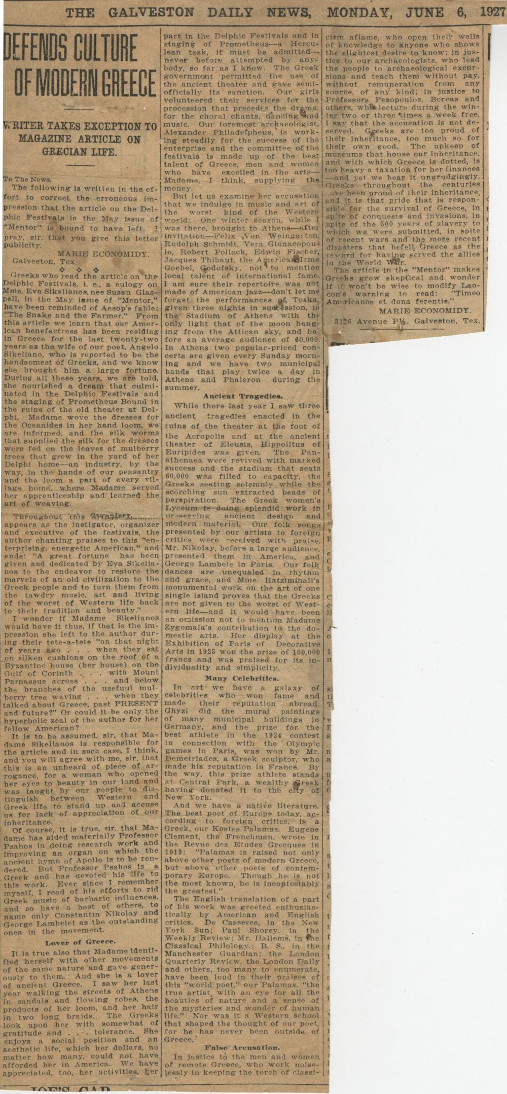 A newspaper page from the Galveston Daily News, dated Monday, June 6, 1927, contains an article titled "Defends Culture of Modern Greece Writer Takes Exception to Magazine Article on Grecian Life." The author of the article is Marie Economidy, and it is divided into five sections: first section title is unreadable due to the crease/folding of the page, "Lover of Greece," "Ancient Tragedies," "Many Celebrities," and "False Accusation."