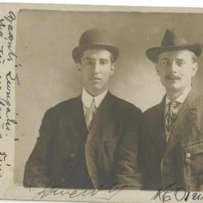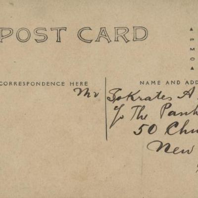 A postcard with handwritten name and address filled out in black ink. The name and address is written in cursive English on the right-hand side. The name and address reads, "Mrs Sokrates A. Xauthaky The Panhellenic 50 Church St New York, N.Y." The correspondence section, left-hand side, is left empty. To the far left is the name and address of the post card company, "Mann's Studio, 1918 1/2 2nd Ave Birmingham, Ala. On the backside is photograph with two well dressed individuals wearing suits and a hat. Underneath the photograph are what appears to be the signatures of the individuals. To the left of the photograph is a message written in Greek using black ink.