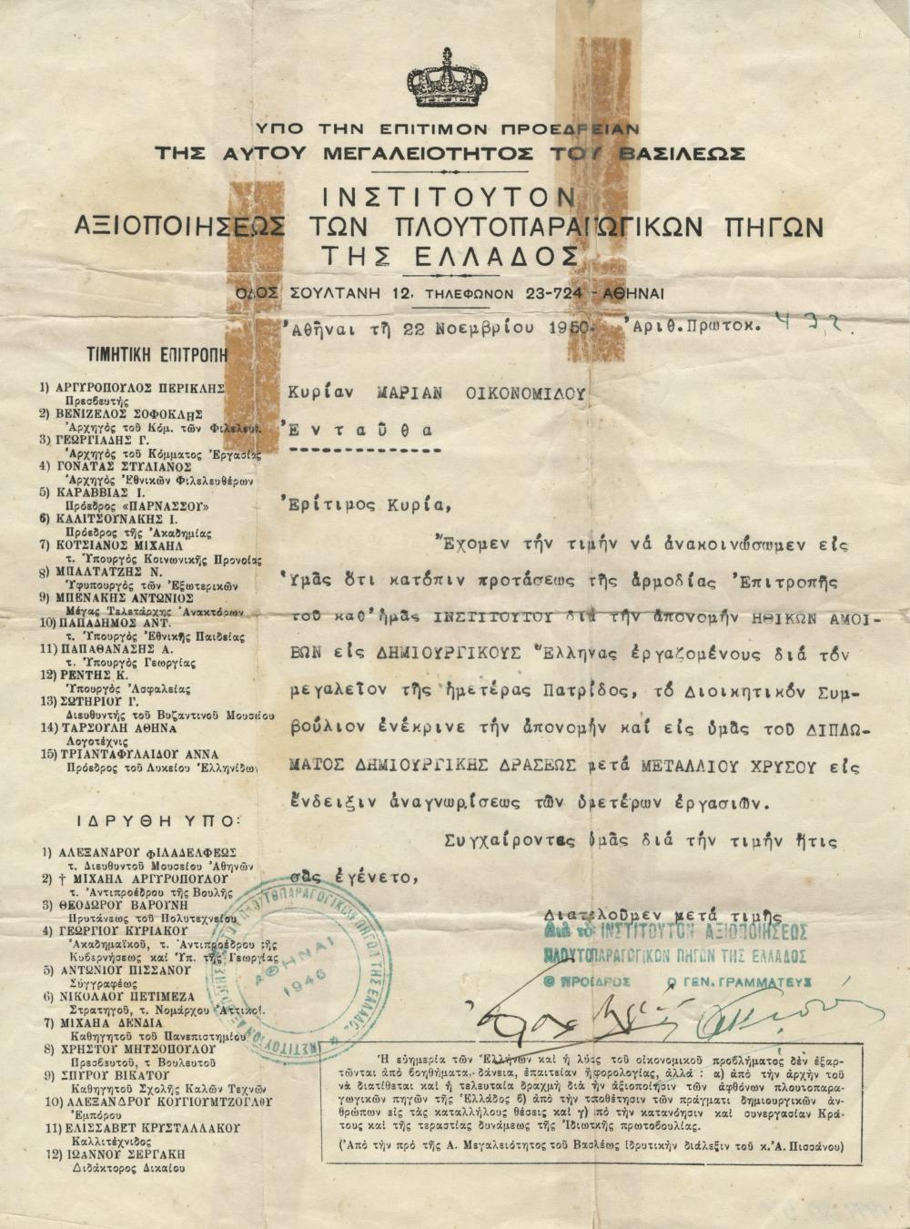 A type letter written in Greek with black ink. In the top center is a logo of a crown with text that translates, "Under the Honorable President of this King's Majesty." Underneith the header is additional text reading, "Institute for Utilization of Wealth Productive Resources of Greece," with a address and dates which reads, "Mount Sultan 12, Telephone 23-724-Athens. Athens on November 22, 1950. No. Original. The numbers 432 is written in blue-green pen." To the left of the letter are two columns. The first column, with the text above the column translates to "Honorary committee" has a numeral list of 15, assumed, names of people with assumed titles/occupations listed below. The second, is a small column located near the bottom, the text translate to, "Establish under" with the names of about 12 individuals with assumed titles/occupations listed below. The letter, located in the center translates, "Mrs. Maria Economidou. Honorable Madam, We have the honor to announce that following the proposal of the competent Committee of our institute for the awarding of Ethical Awards to Creative Greek works for greatness of our motherland, the Board of Directors has approved the award to you as well of the Double Eye Creative Activity after Gold medal in recognition of both works. Congratulating you on your honor." The bottom of the letter is stamp with two seals and has a a paragraph of text enclosed in a box. The two seals, a blue circular seal located on the bottom left, and a rectangular blue seal with text and a signature located on the bottom right.