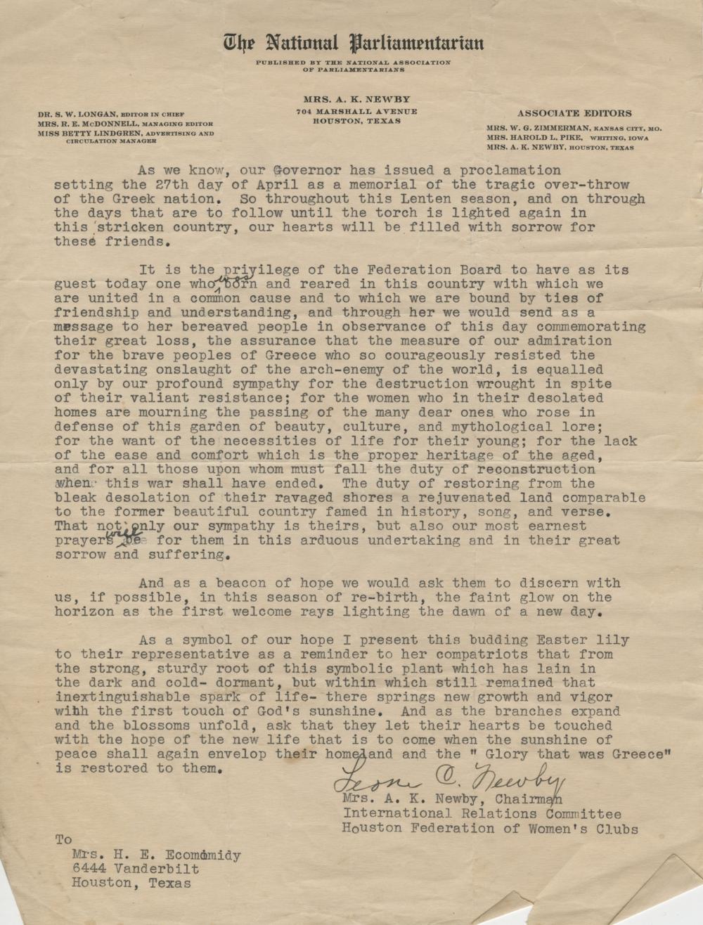 A typed letter from The National Parliamentarian. Located in near the top, central page, is the document's header which reads, "The National Parliamentarian Published by the National Association of Parliamentarians." Underneith the headers is text that reads, Mrs. A.K Newby 704 Marshall Avenue Houston, Texas." On the top, left corner are a list of individuals: Dr. S.W Longan, Editor in Chief, Mrs. R.E McDonnell, Managing Editor, and Miss Betty Lindgren, Advertising and Circulation Manager. To the right, top corner, is a list of "Associate Editors": Mrs. W.G. Zimmerman, Kansas City, Mo. Mrs. Harold L. Pike, Whiting, Iowa, and Mrs. A.K. Newby, Houston, Texas. At the bottom, right corner, is text stating the addressor, "To Mrs. H. E. Economidy, 6444 Vanderbilt Houston, Texas." The letter is signed off by the Leon C. Newby. Underneith the signature is additional text reading, "Mrs. A. K. Newby, Chairman International Relations Committee Houston Federation of Women's Clubs."
