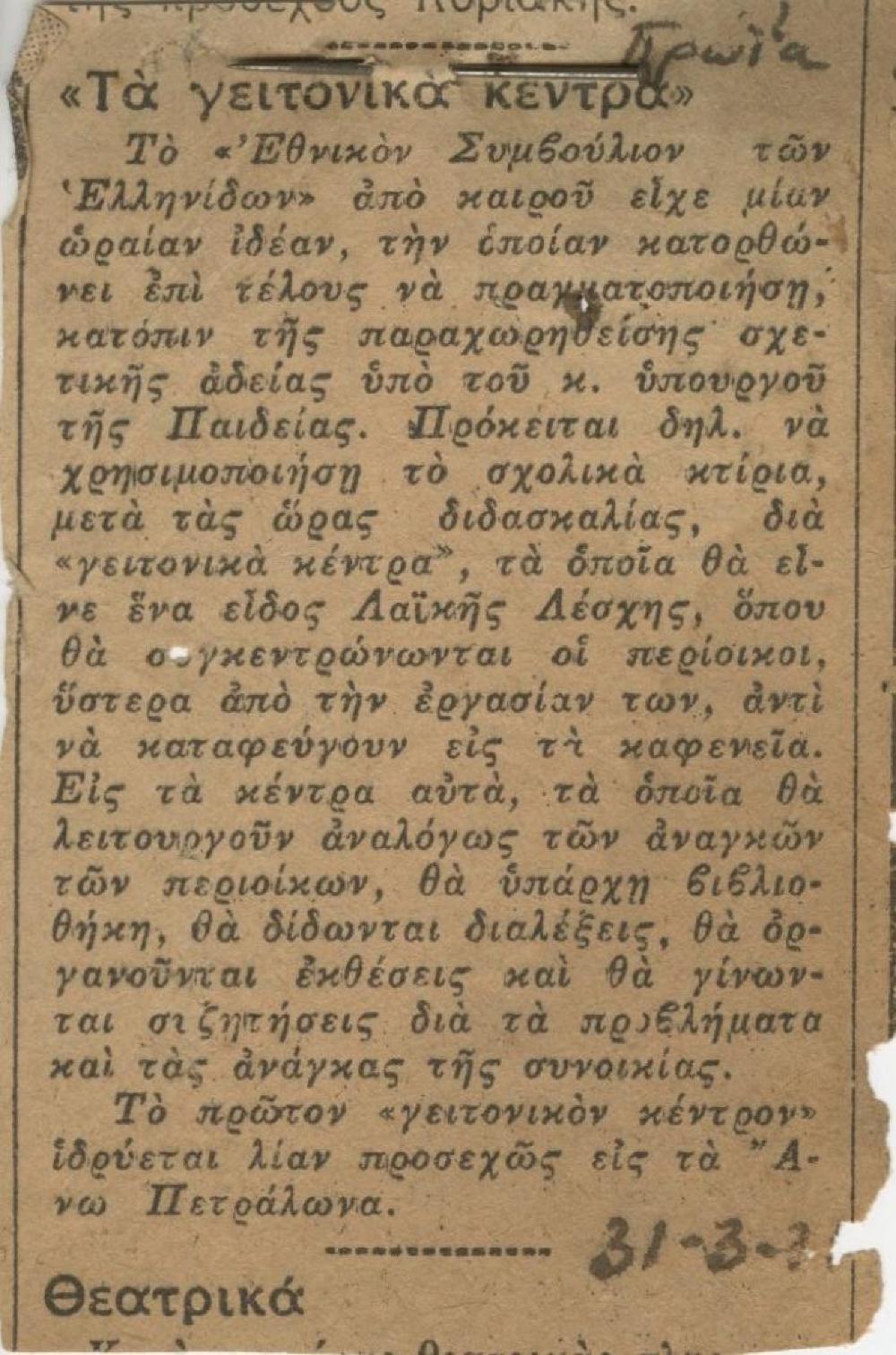 A small newspaper clipping typed in Greek. The article is titled, " << Tά yεiτovikά Kεvτpα>>" (English: The neighboring centers) Above the title is a small pin and a word," Πρωία" (English: Morning) written in pen. At the bottom is an assumed date, 31-3-3 also written in black pen. The newspaper article has tearing along the edges and two pin-size-holes within the center of the clipping.