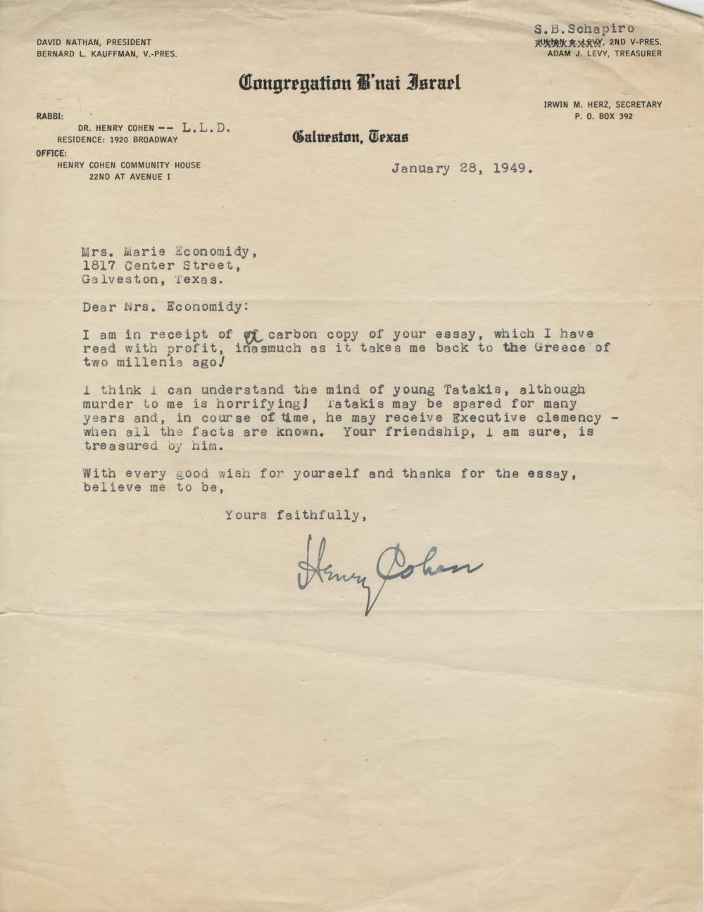 A typed letter from the Congregation B'nai Israel to Mrs. Marie Economidy, located in 1817 Center Street Galveston, Texas. The letter is written in English and is broken into three short paragraph. Located at the top, center page, is the letter's header which reads, "Congregation B'nai Israel Galveston, Texas, with the dated, January 28, 1949 located underneath. In the upper left corner is the name of the two individuals, "David Nathan, President, and Bernard L. Kauffman, V.-Pres." Below the names of the President and V-Pres is the name of the Rabbi and Office. "Rabbi: Dr. Henry Cohen--L.L.D. Residence:1920 Broadway." "Office: Henry Cohen Community House 22nd At Avenue I." Located in the upper right corner are the names of three individuals, "S.B Schapiro xxxxxxx, 2nd V-Pres. Adam J. Levy, Treasure, and Irwin M. Herz, Secretary P.O. BOX 392." Near the bottom of the letter is the signature of Henry Cohem signed in black pen,