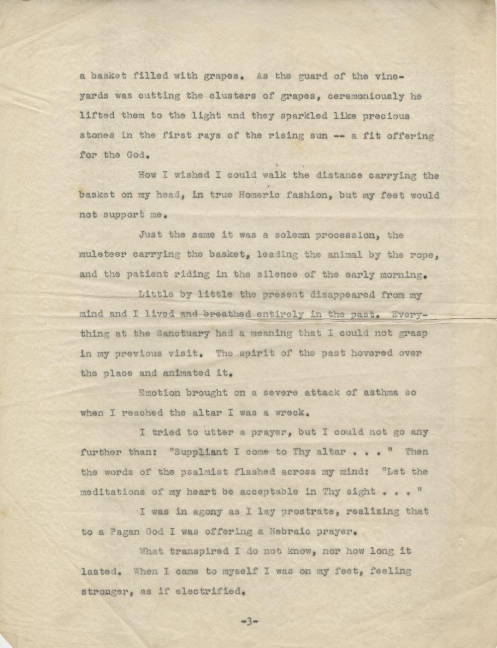 A typed four paged document, possibly lecture or essay, on thin, nearly translucent paper, with black ink text. The document is broken down into eight paragraphs and due to the thinness of the paper, outlines of the text form the third page can be seen. Near the bottom of the page, located in the center, is the number three with a dash marks on the sides of the number.