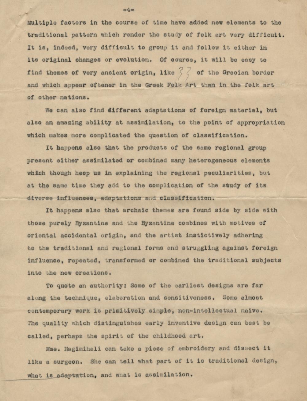 A typed six paged document, possibly lecture or essay, on paper with black ink text. The document is broken down into six paragraphs with the number -4- near the central top of the page.