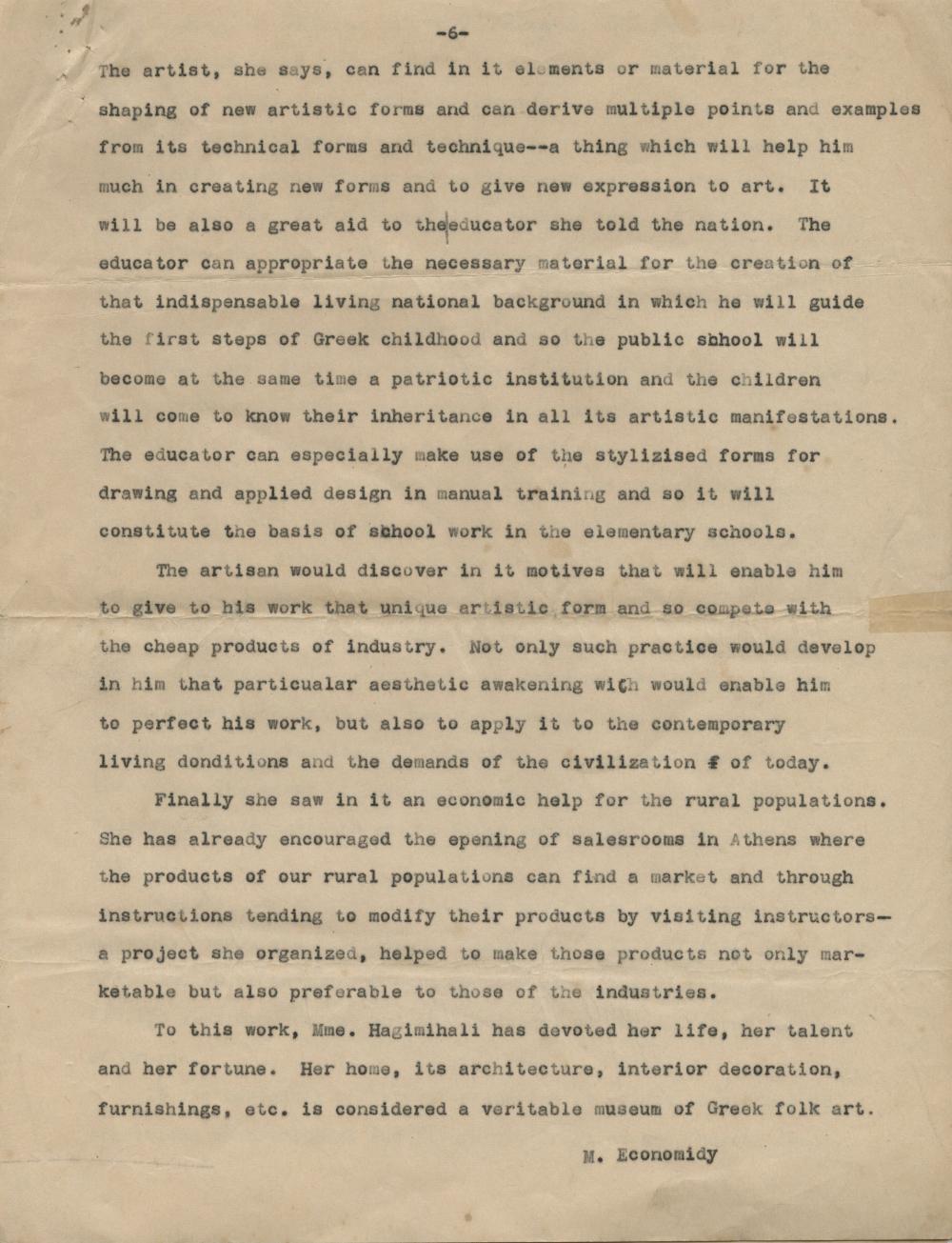 A typed six paged document, possibly lecture or essay, on paper with black ink text. The document is broken down into six paragraphs with the number -6- near the central top of the page. At the bottom of the page is the name, "M. Economidy."